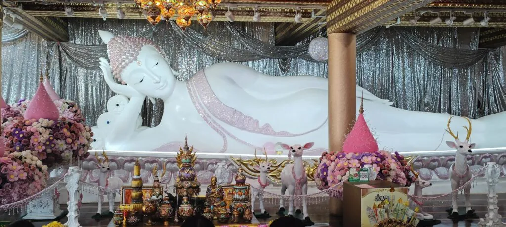 אווירת שמחה שורה במתחם ואנחנו מצטרפים להמוני האנשים הכורעים ומתפללים לדמויות הבודהה לבושות בורוד. איילים ורודים בחזית הבמה. פרחים ורודים ולבנים. ניחוח קטורת מתוק. חלום פונץ' בננה.