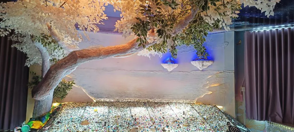 דוכני ממכר תכשיטים ובשמים בצבעי פסטל. מוזר. הכל מאוד מבריק ונוצץ.