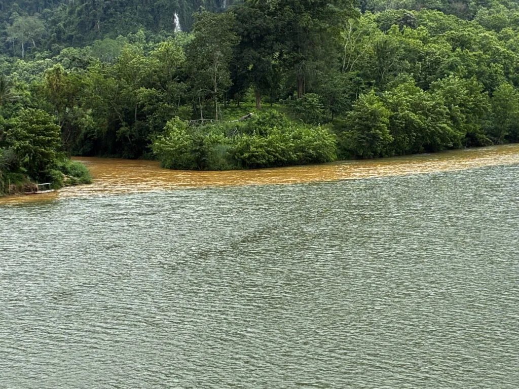 שני צבעים בנהר נראים בבירור. מפגש בין מי המקונג הבוצי למים הירוקים של נהר Nam Ou.