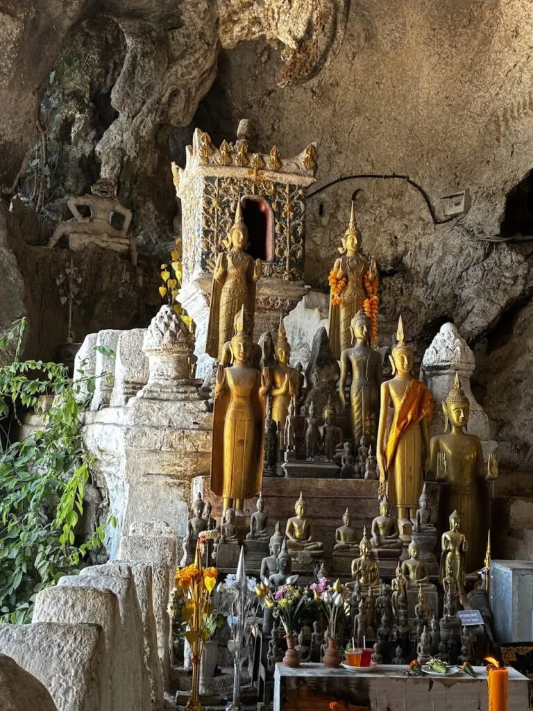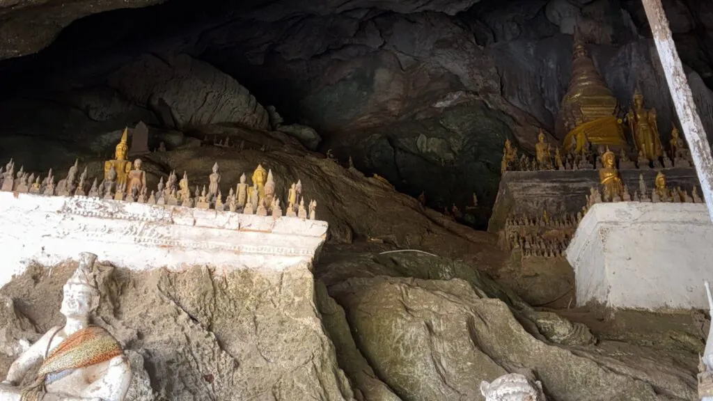 במערה הראשונה: Tham Ting יש אוסף פסלי בודהה קטנים וגדולים. חביב. לא נפלנו… אפשר להבחין גם בראש בודהה שוכב וישן באפלולית המערה.