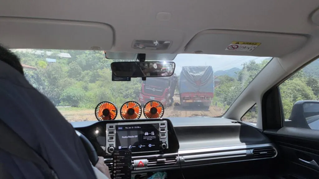 לנסיעה לאטרקציות מחוץ לעיר, נעזרנו בשירותי נהג עם רכב. תחילה סברנו שנשכור רכב, וניסע עצמאית. זה לא קרה ומזל שכך. כי הדרכים מחוץ לעיר, משובשות וגרועות מאוד וככל שמתרחקים מהעיר, הדרכים הופכות בלתי סבירות בעליל. למעשה הדרכים ברובם הם כבישים הרוסים, מלאי בורות. קשים למעבר ועמוסים בצורה מטורפת במשאיות המעבירות סחורות מלאוס לסין. כלומר דרך של פחות ממאה ק"מ לקחה לנו כארבע וחצי שעות…