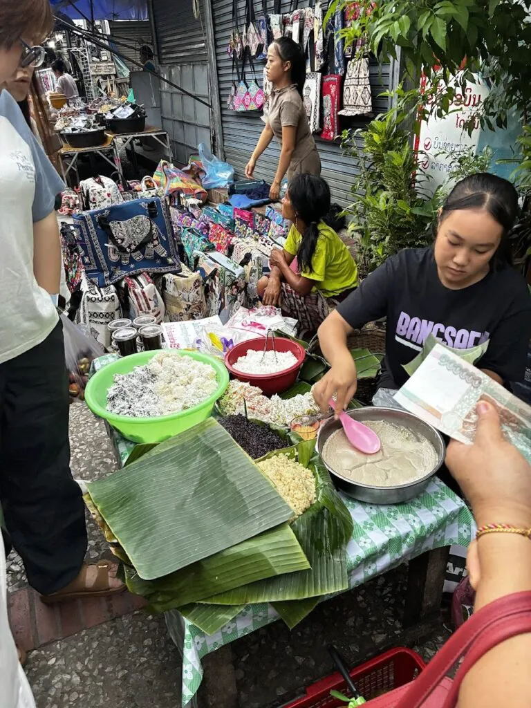 מה אפשר לקנות בשוק הבוקר? מאכלים שונים, ירקות ומצרכים שונים. מיץ טרי סחוט במקום. ממתקים מקומיים. דבש ופטריות מרפא… סלי אידוי מסורתיים לאורז.