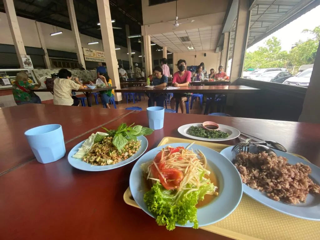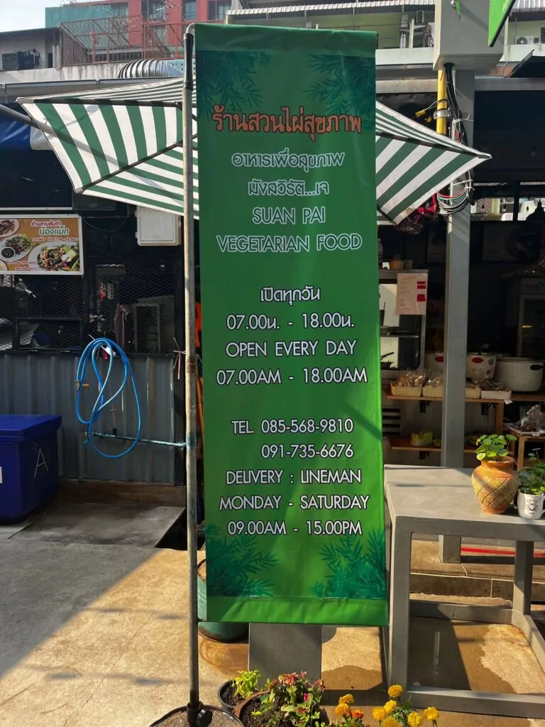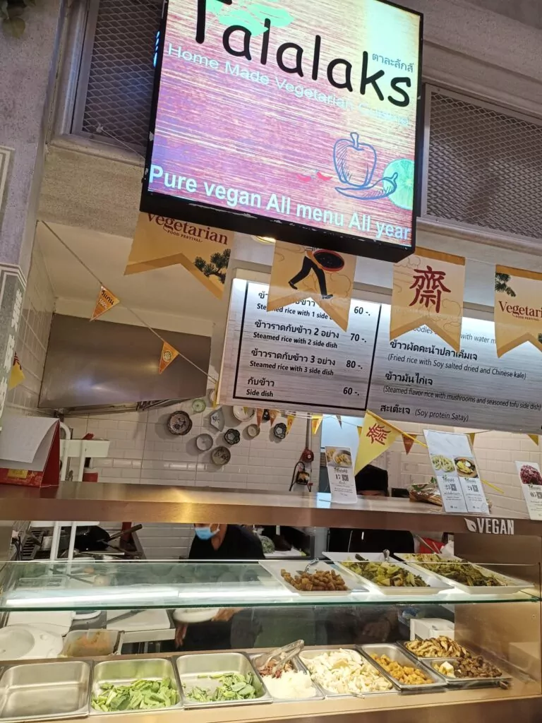 6. טרמינל 21 בקומה העליונה, במרכז האוכל: דוכן צמחוני – Mungsavirat – มังสวิรัติ – מנות זולות, חריפות וטעימות.