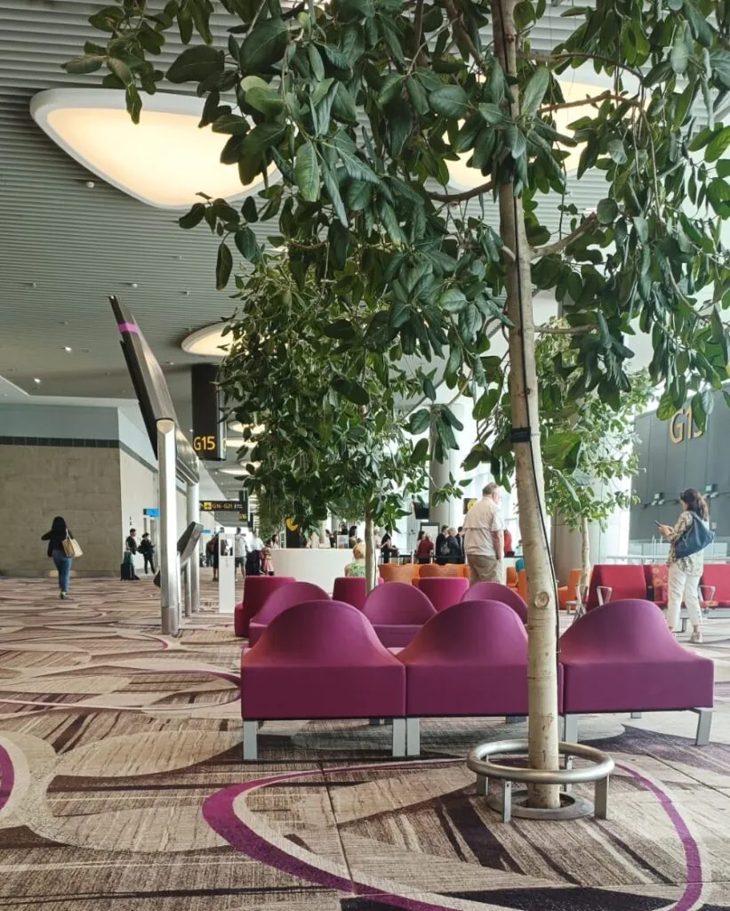 עצים אמיתיים בין הכורסאות המעוצבות בטרמינל
